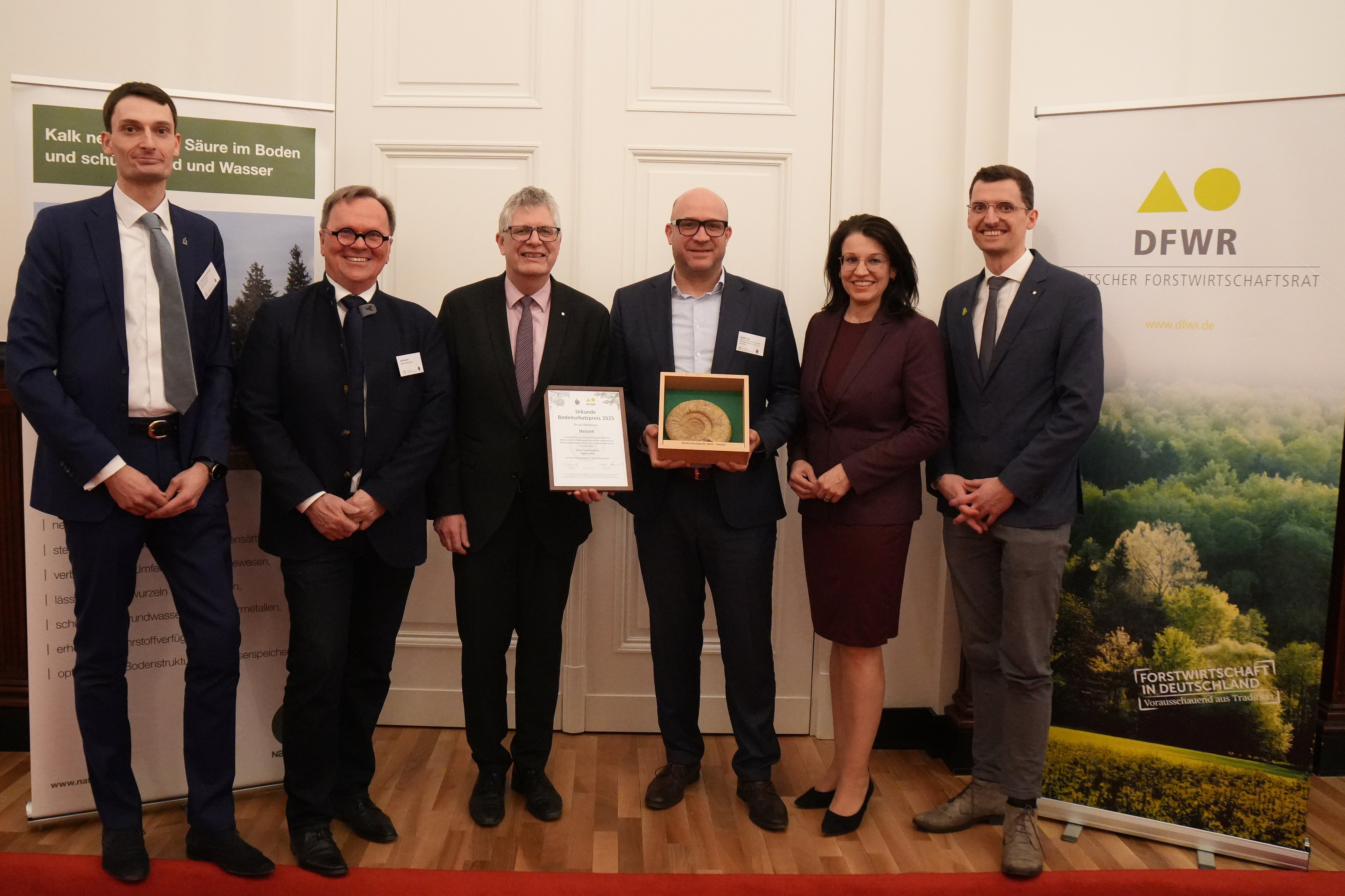 Der Bodenschutzpreis 2025 des Deutscher Forstwirtschaftsrat (DFWR) und des Kalkverband Agrar geht an das Land Hessen. Im Rahmen eines parlamentarischen Abends in Berlin nahm Ingmar Jung, Minister für Landwirtschaft und Umwelt in Hessen, stellvertretend für das Bundesland den Preis für das besondere Engagement im klimaresilienten Waldmanagement und bei der konsequenten Umsetzung der Bodenschutzkalkung dankend entgegen.
