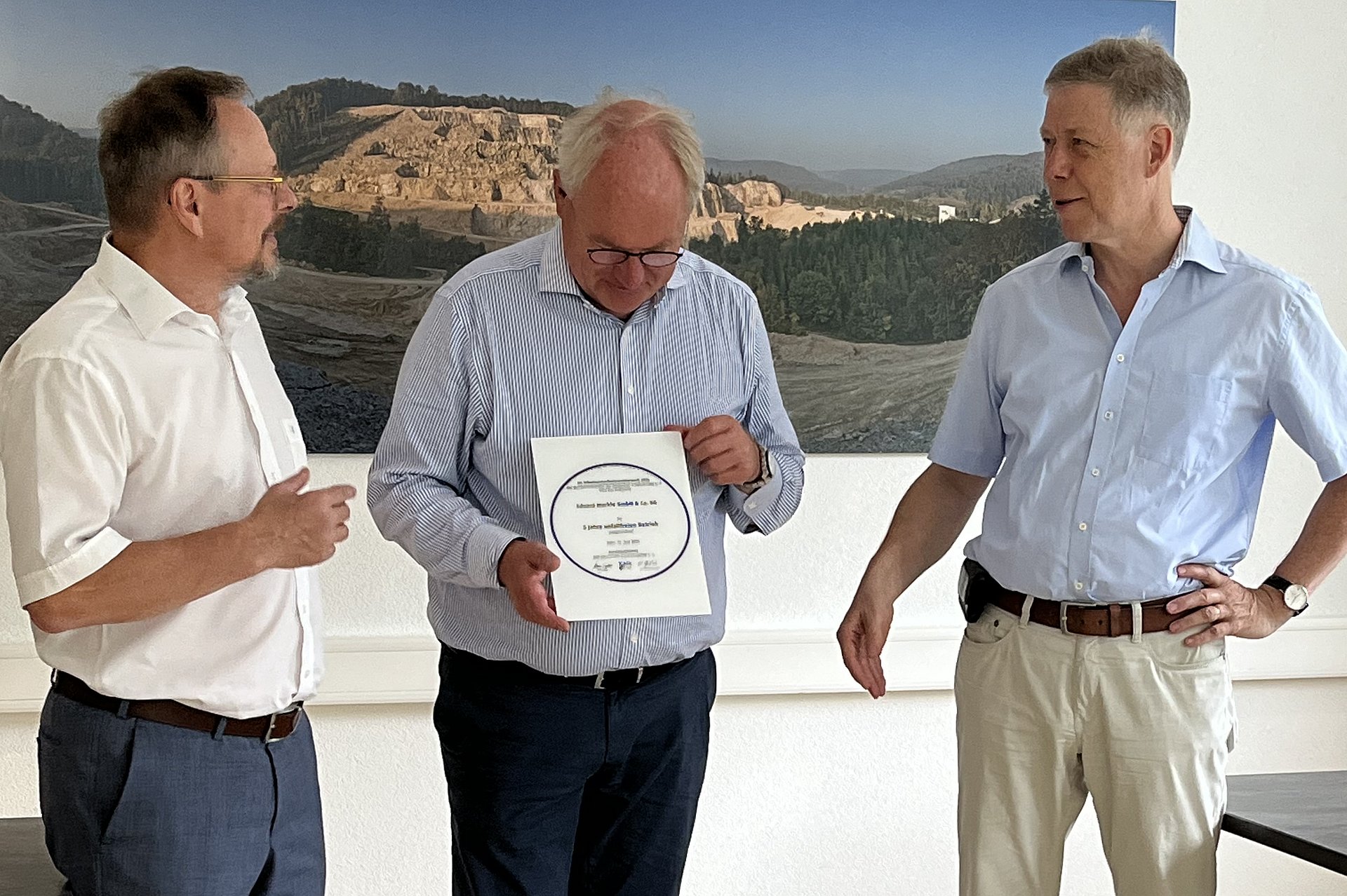 Im Kreise der Kolleginnen und Kollegen der Eduard Merkle GmbH & Co. KG überreichten RA Martin Ogilvie und Dr. Klaus-Ruthard Frisch die Auszeichnung an Hartmut Koch-Czech und stellvertretend für die Belegschaft -den Betriebsrat.